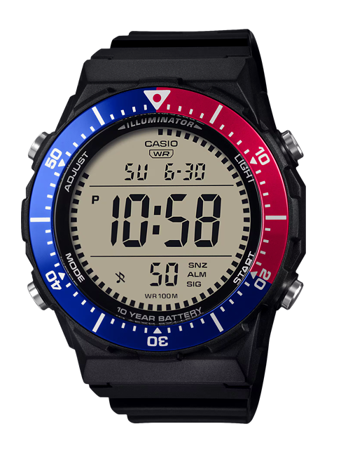 Часы получили дайверскую стилистику с разметкой на вращающемся пепси-безеле и начальный базовый функционал в виде отображения текущего времени, даты и дня недели, имеют на борту секундомер и таймер, а также 3 ежедневных будильников, ежечасный сигнал и батарею на 10 лет.