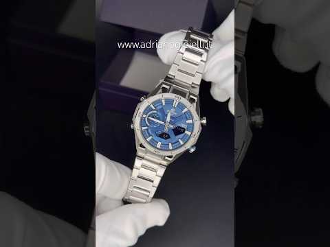 Модель получила стильный и эргономичный многоуровневый циферблат, который сочетает в себе индикацию времени с помощью контрастных стрелок, два цифровых инверсионных дисплея и стрелочный ретроградный указатель бирюзового оттенка у отметки девяти часов.