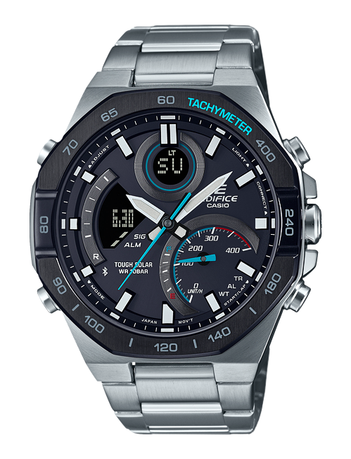 Начинка часов не отстает от внешнего вида: солнечная батарея, обеспечивающая часам неиссякаемый заряд энергии, технология Bluetooth®, позволяющая синхронизировать часы со смартфоном, высокоточный секундомер с шагом 1/1000 секунды, привычная для часов Edifice водозащита 100 метров и двойная светодиодная подсветка.