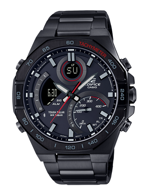 Начинка часов не отстает от внешнего вида: солнечная батарея, обеспечивающая часам неиссякаемый заряд энергии, технология Bluetooth®, позволяющая синхронизировать часы со смартфоном, высокоточный секундомер с шагом 1/1000 секунды, привычная для часов Edifice водозащита 100 метров и двойная светодиодная подсветка.