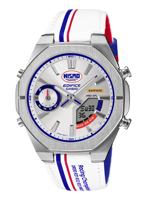 За основу дизайна модели взяты цвета заводской команды Nissan, а на ремешке часов вы найдете названия всех моделей гоночных авто команды, с которыми Nismo завоевывали титулы с 1984 по 1997 года.