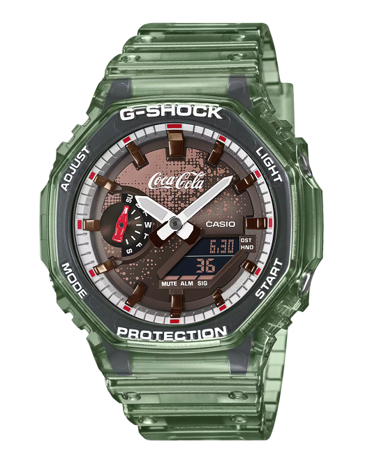 Джишоки получили полупрозрачный корпус зеленого оттенка, как у бутылки Coca-Cola 1915 года, когда у бренда впервые появилась та самая узнаваемая форма стеклянной бутылочки. "Шипучий" циферблат часов венчают контрастные стрелки и логотип бренда, а индикатор у 9 часов по циферблату стилизован в виде красной бутылочки колы. Это не все пасхалки модели, спрятанные во внешнем виде часов, рекомендуем внимательно рассмотреть дополнительные фото модели ниже.
