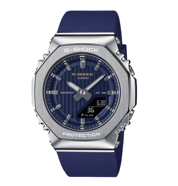 Несмотря на появление металла, эта модель в стальном корпусе с необычным текстурным циферблатом синего цвета может похвастать своей легкостью в 56 грамм, компактностью и толщиной корпуса всего в 11 мм, что впечатляет на фоне более массивных собратьев по серии G-Shock.