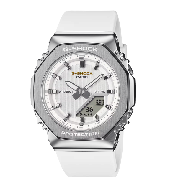 Несмотря на появление металла, эта модель в стальном корпусе с необычным текстурным циферблатом светлого оттенка может похвастать своей легкостью в 56 грамм, компактностью и толщиной корпуса всего в 11 мм, что впечатляет на фоне более массивных собратьев по серии G-Shock.