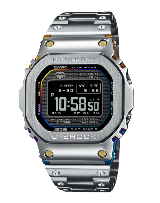 Напомним, что модель является родным братом популярной стальной серии GMW-B5000, однако имеет ряд важных отличий. Инженеры Casio переработали структуру корпуса, теперь между передней и задней частями стального корпуса размещен слой эластичного полимера, поглощающий любые удары и механические воздействия, защищая обновленный модуль часов.