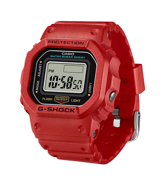Кольцо-часы в красном полимерном корпусе DWN-5600 из серии G-SHOCK NANO является уменьшенной почти в 10 раз копией легендарных джишоков DW-5600 весом всего в 6 грамм и показывает точное время с быстрым переключением во второй часовой пояс, имеет подсветку, секундомер, водозащиту в 20 Бар и минеральное стекло.