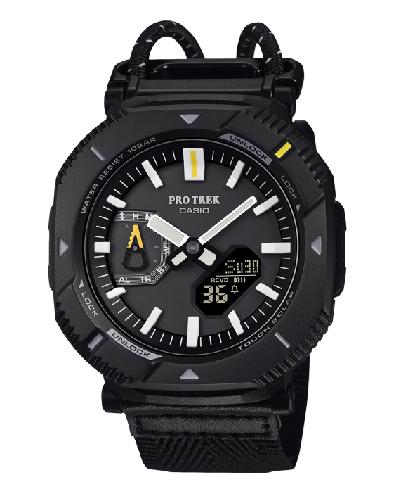 Отдельно отметим яркий индикатор режима у девяти часов, стилизованный под карабин и вращающийся безель часов с функцией блокировки кнопок: при его повороте боковые кнопки часов становятся защищены от случайных нажатий на маршруте — интересное и харизматичное решение, которое вы не встретите на сегодняшний день в других моделях Casio.