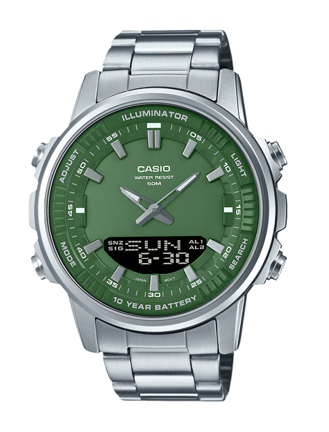 Эти аналого-цифровые часы выполнены на стальном браслете и отображают текущие число, месяц и день недели, а также имеют на борту секундомер, таймер, 3 ежедневных будильника и ежечасный сигнал, записную книжку для телефонов или паролей на 30 записей, а также батарейку на 10 лет.