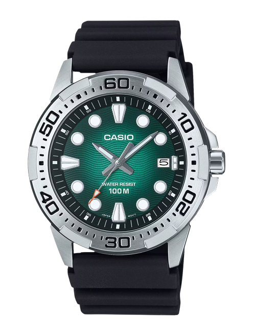 Часы выполнены в дайверской стилистике, получив массивный безель и крупные метки циферблата. Добавьте сюда водозащиту в 10 Бар, отображение дня недели, удобный полимерный ремешок, чтобы получить прекрасную "рабочую лошадку" на каждый день.