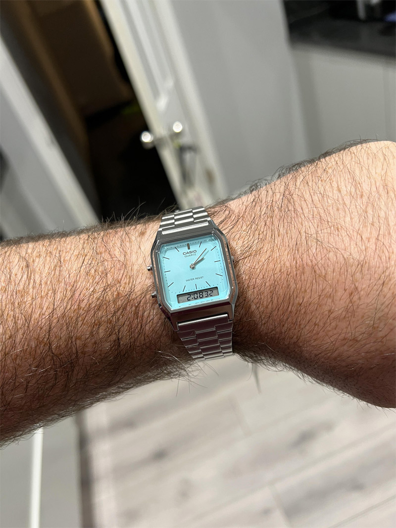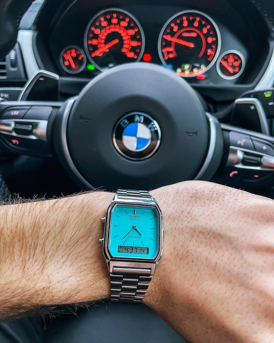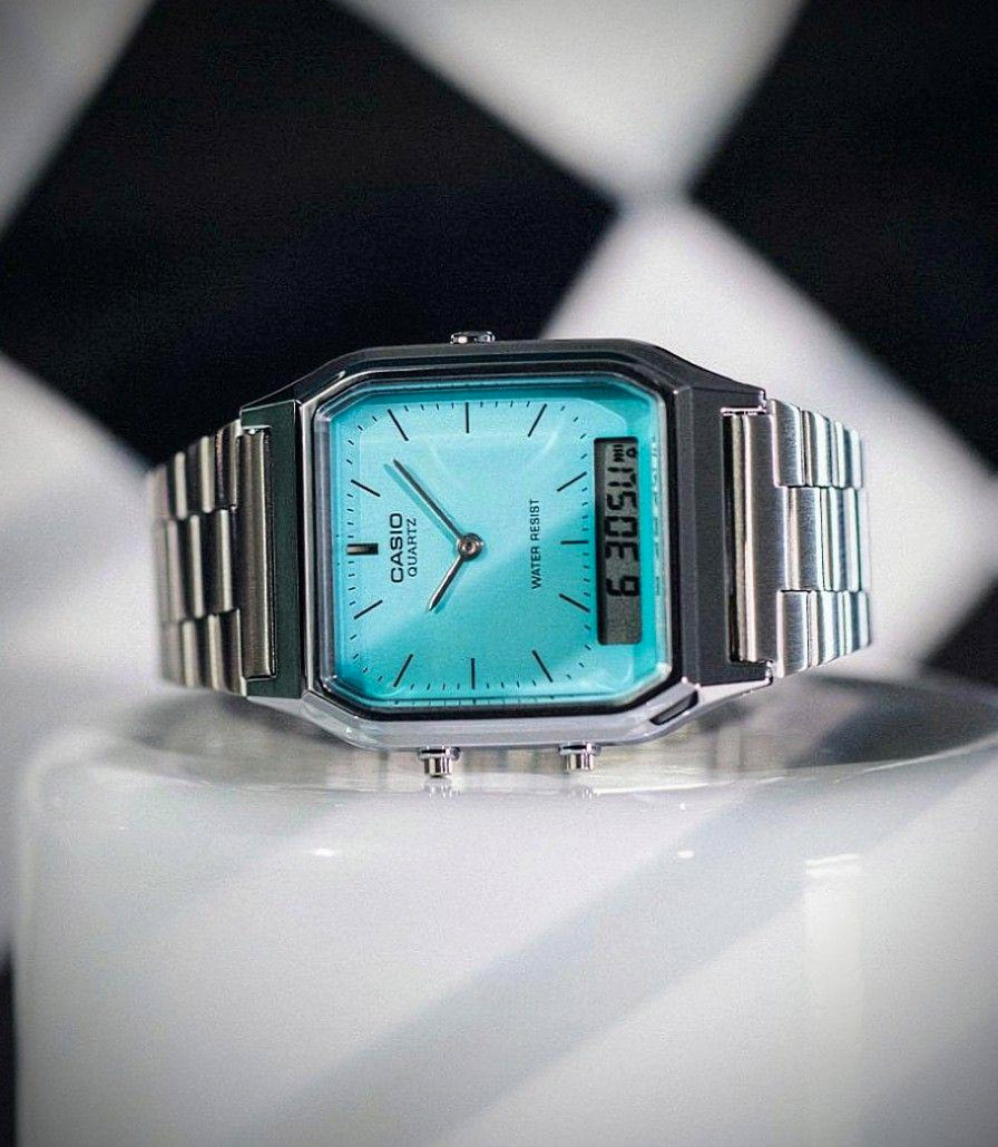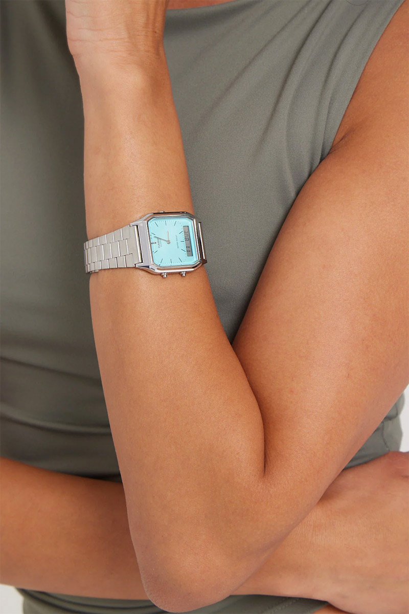 Перед вами редкая и харизматичная унисекс модель из серии CASIO VINTAGE в пластиковом корпусе AQ-230 с металлическим покрытием стального цвета, ярким циферблатом цвета тиффани и дополнительным дисплеем в нижней части корпуса.