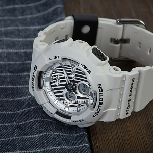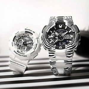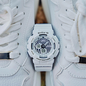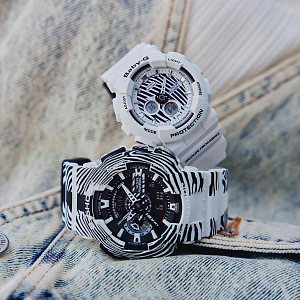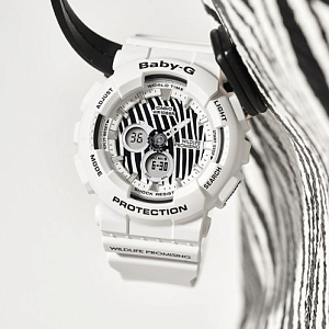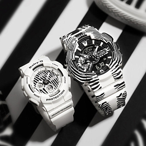 Редкая лимитированная аналого-цифровая модель BABY-G из серии BA-120 в белом цвете с зебра-камуфляжем на циферблате отлично подойдет в качестве часов на каждый день или станет верным партнером во время занятий спорта и активного времяпровождения.