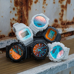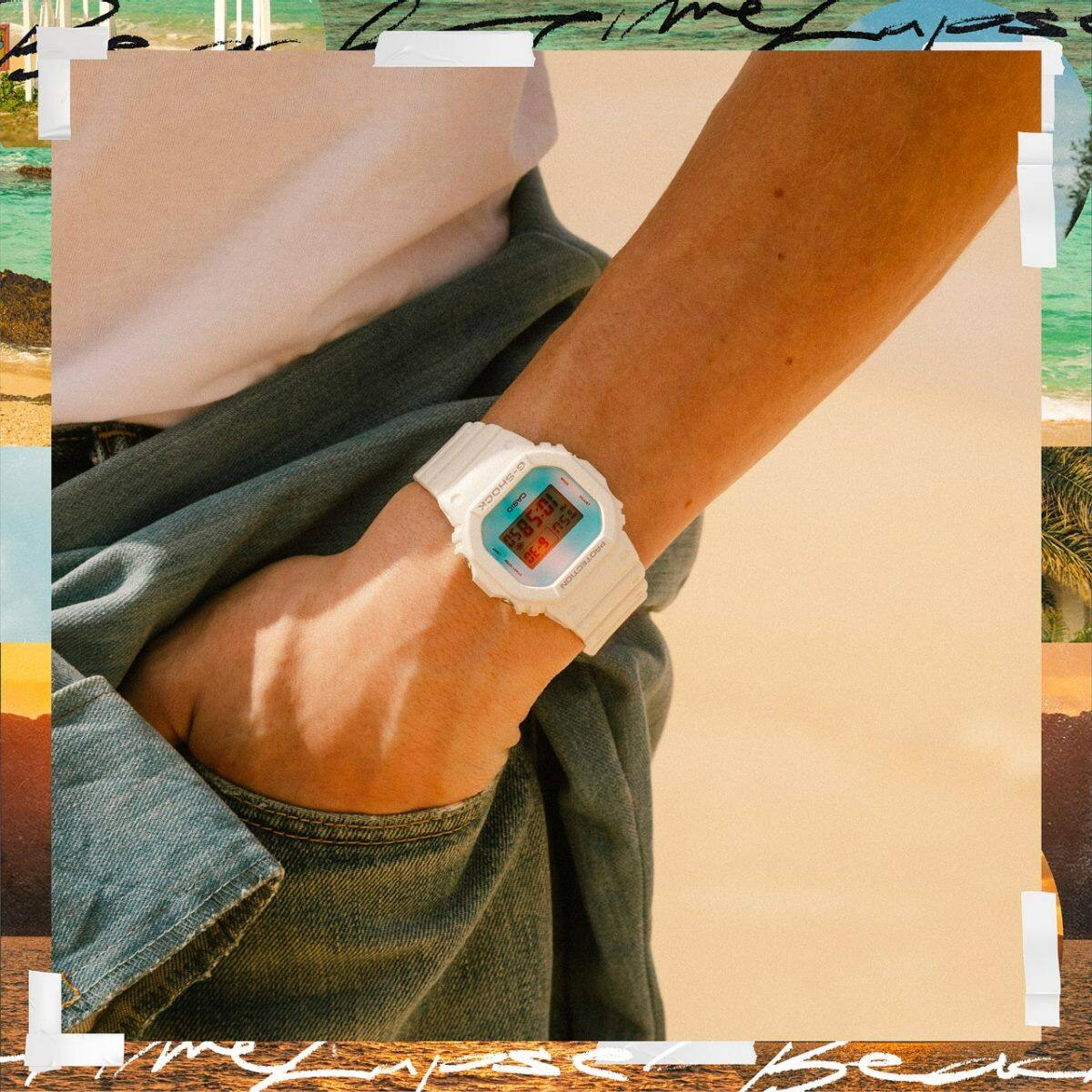 Супер редкие лимитированные джишоки 2024 года в белом корпусе из серии G-SHOCK DW-5600 c ярким эффектным циферблатом. Этим эффектом дизайнеры Casio делают отсылку к летнему утру на пляже, к летнему небу на восходе, которое часто меняет свой оттенок и играет красками восходящего солнца.
