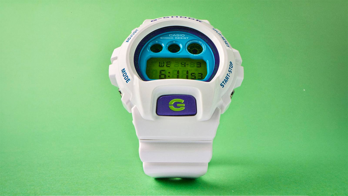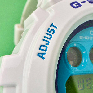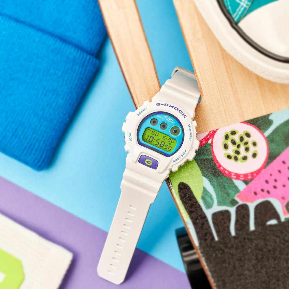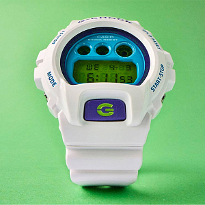 Перед вами редкий лимитированный релиз 2024 года из серии G-SHOCK DW-6900 в белом глянцевом корпусе с ярким бирюзовым циферблатом и сиреневыми деталями.