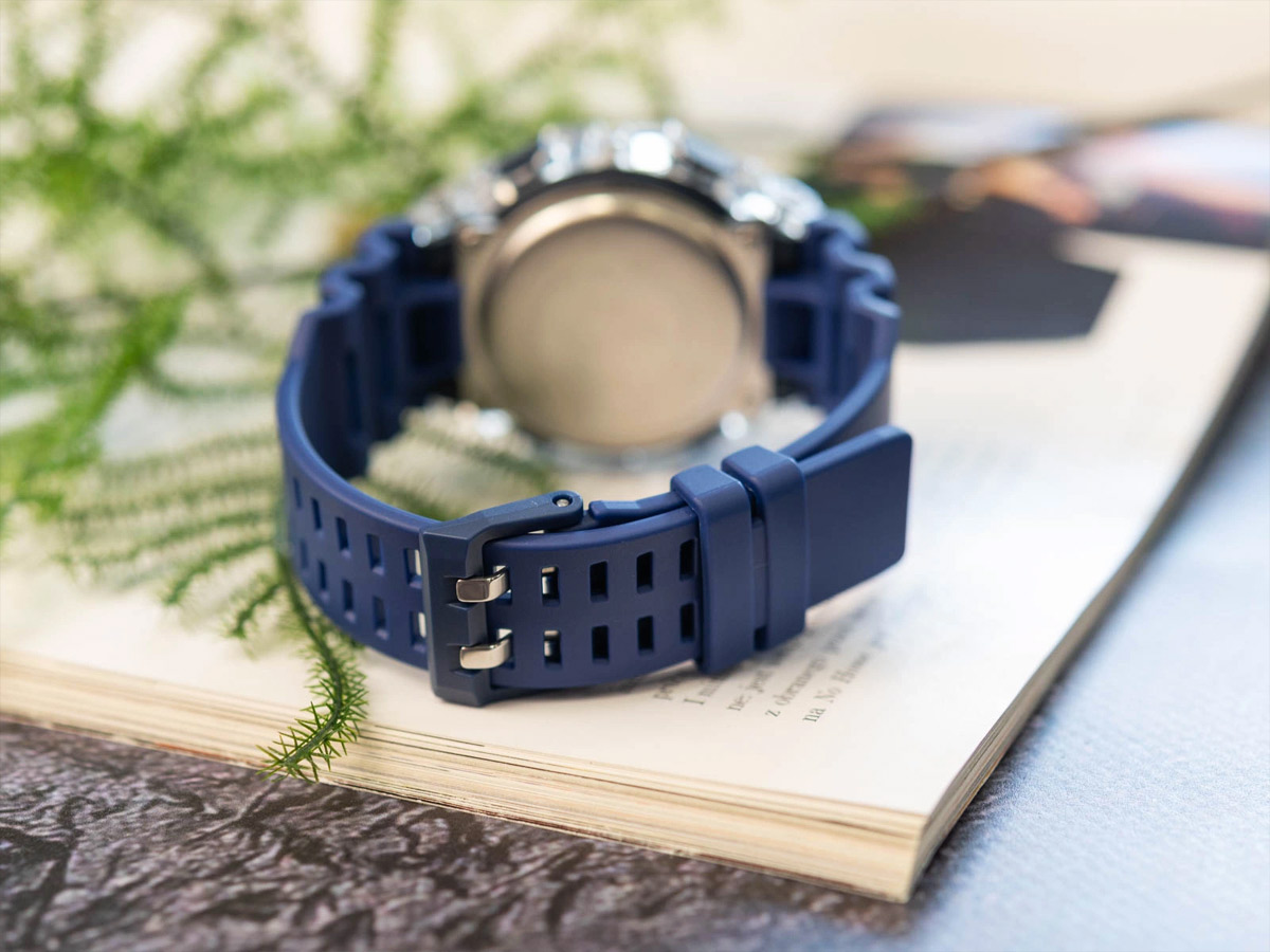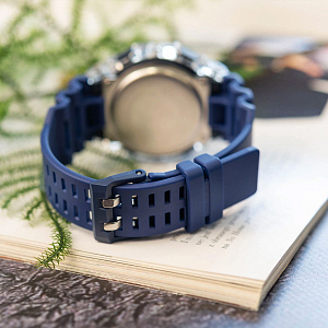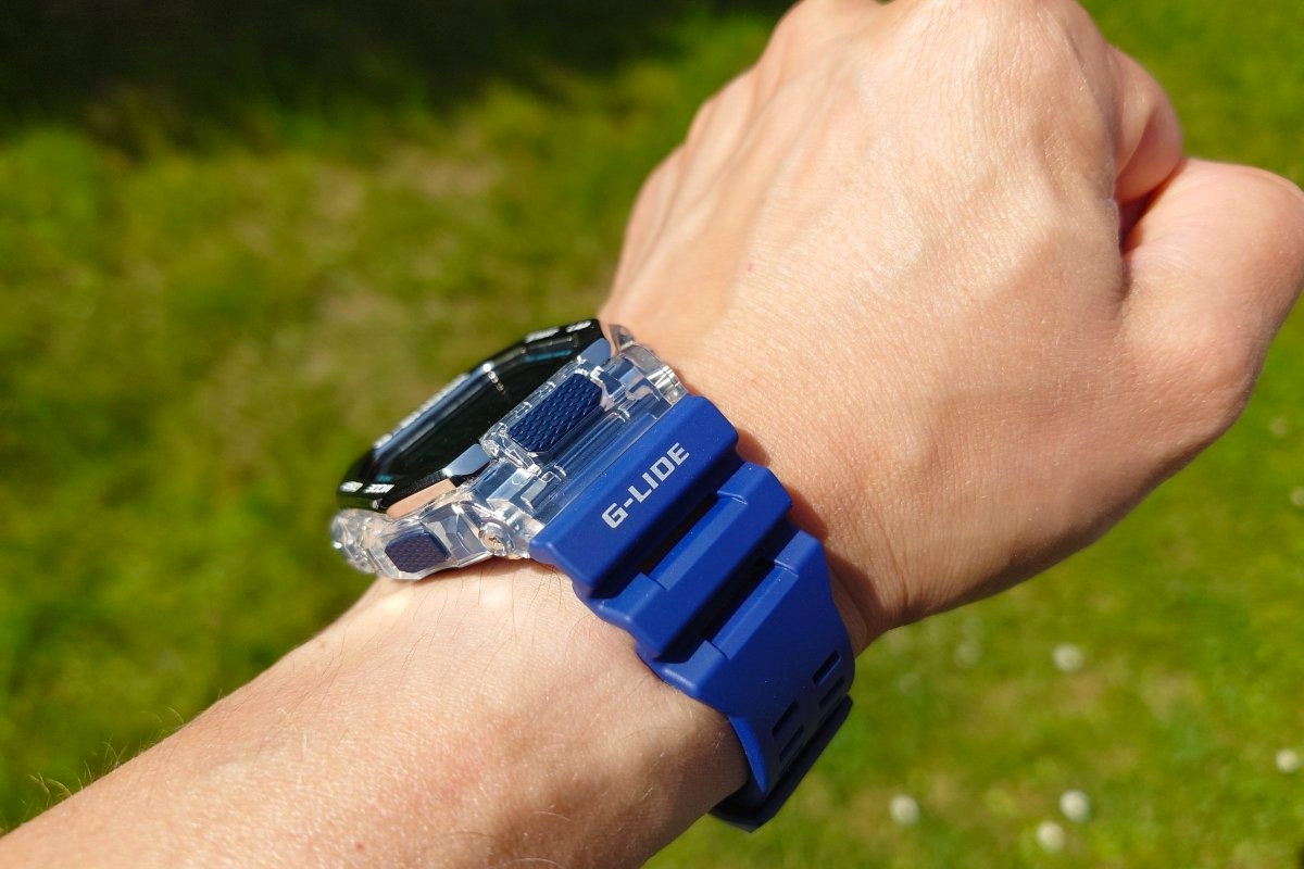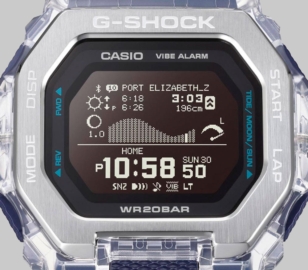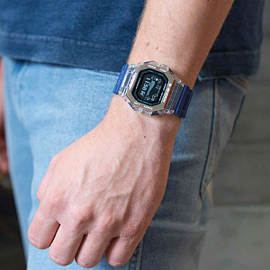 Супер стильная цифровая модель джишок 2025 года в полупрозрачном скелетоновом корпусе GBX-100 на синем полимерном ремешке. Эта модель из серферско-бордерской серии G-SHOCK G-LIDE получила новый информативный MIP инверсионный дисплей, который защищен от повреждений стальным безелем и прочным минеральным стеклом.