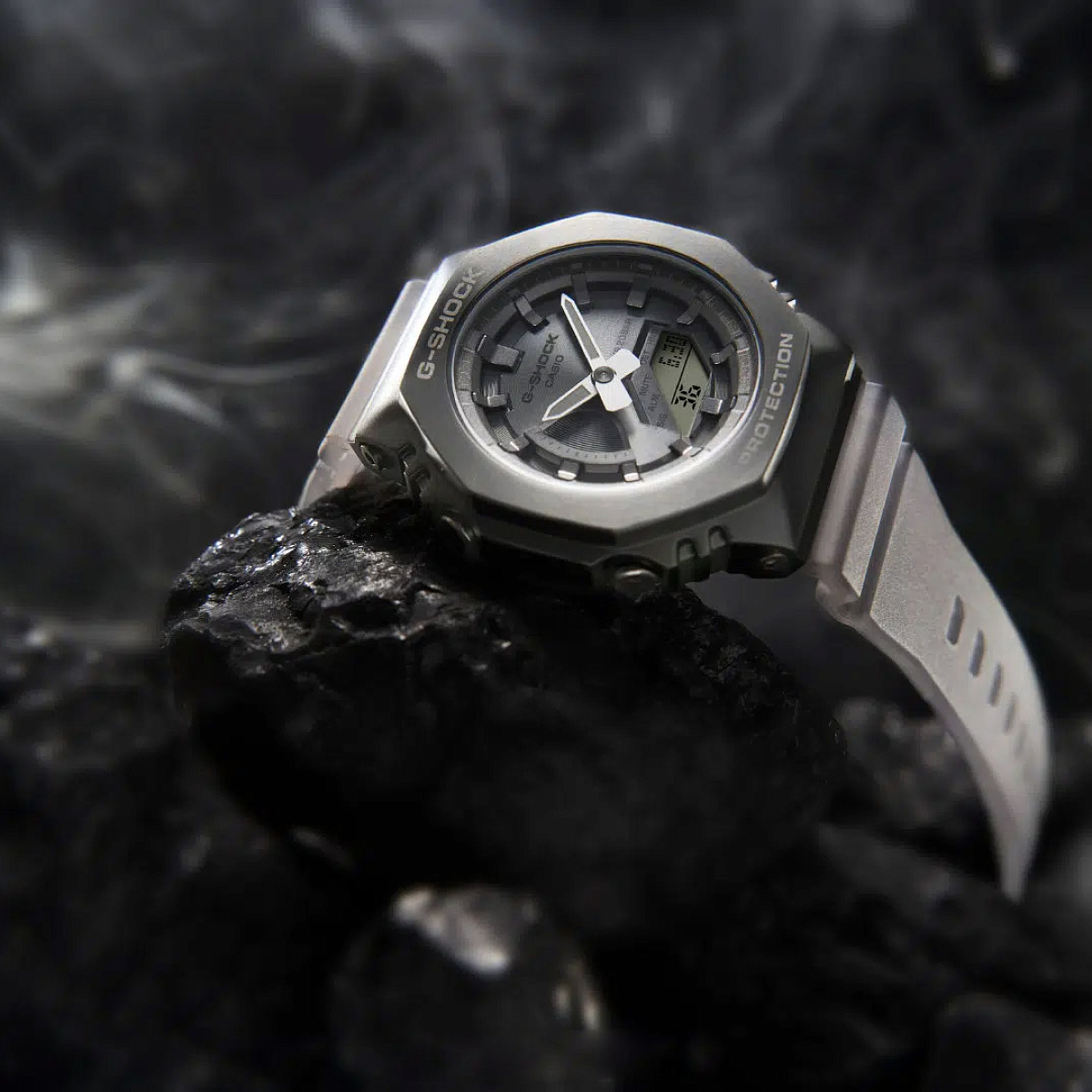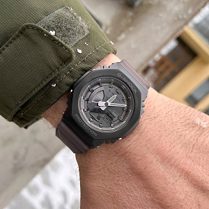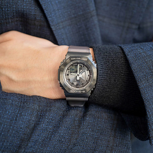 Стильный лимитированный релиз начала 2022 года из свежей серии компактных G-Shock GM-S2100 в расцветке Midnight Fog (туман ночного города). Часы выполнены в матовом стальном темно-сером корпусе в форме октагона на полупрозрачном полимерном ремешке. Эта унисекс-серия джишоков является уменьшенным вариантом моделей GM-2100 и подходит даже для утонченных женских запястий.
