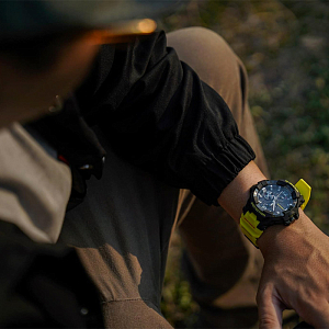 Перед вами редкий лимитированный релиз Casio 2025 года — сверхпрочная аналоговая модель G-SHOCK GR-B300 из серии GRAVITYMASTER в черном фактурном корпусе на ярком полимерном ремешке. Часы появились в рамках традиционной для бренда G-SHOCK "спасательной серии", когда модели получают яркую расцветку с отсылками к форме и оборудованию спасательных команд, используемых для обозначения своего присутствия при работе в суровых условиях, таких как плохая погода и плохая видимость. В обновленном корпусе часов используется технология Carbon Core Guard: модуль часов защищает легкий и сверхпрочный полимерный корпус с углеродным армированием, а циферблат покрыт прочным закаленным минеральным стеклом.