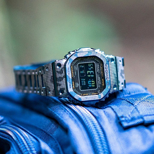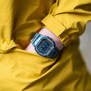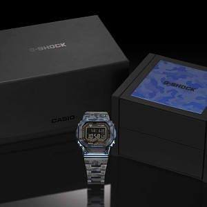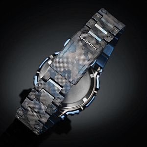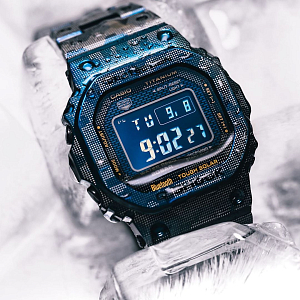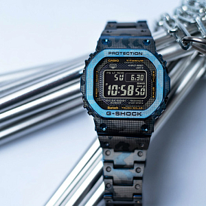Перед вами супер-лимитированный релиз второй половины 2020 года! Легендарный олдскульный корпус GMW-B5000, облаченный в сверхпрочный и легкий титановый корпус со стильным камуфляжным принтом синего оттенка! Дизайнеры Casio назвали расцветку модели "Summer Ice Blue" из-за сходства получившегося дизайна с тающим на солнце льдом. Для получения уникального паттерна Casio использовала лазерную точечную технологию нанесения, а дополнительное износоустойчивое DLC-покрытие, защищает часы от царапин и повреждений. Отдельно стоит отметить, что инверсионный дисплей модели защищает прочное сапфировое стекло.