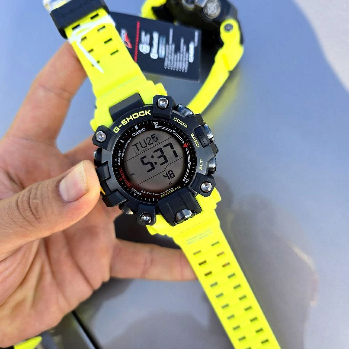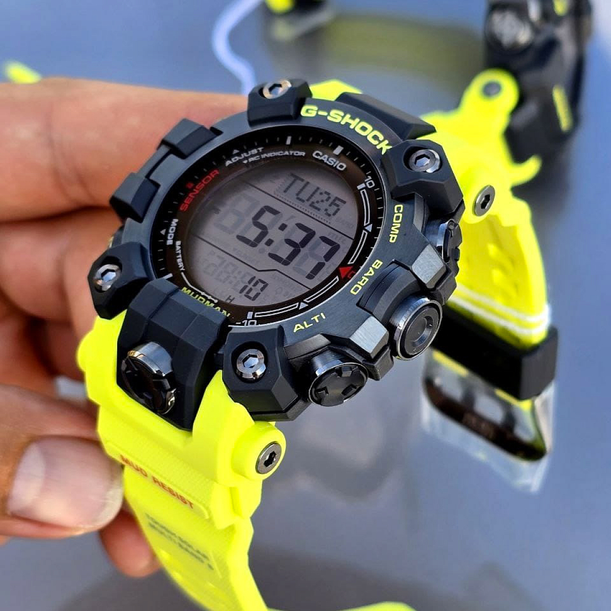 Напомним, что G-SHOCK MUDMAN — это профессиональная серия джишоков созданная для путешествующих и работающих "на земле" людей. Модели мадман оснащены датчиками, а также солнечной батареей, обеспечивающей их автономность. Уникальная конструкция и противо-грязевое покрытие позволяет работать с часами в самых экстремальных природных условиях.