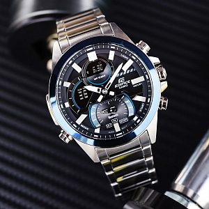 Обновленная расцветка 2023 года из аналого-цифровой серии ECB-30 в стальном корпусе с темным циферблатом и синим безелем, покрытым минеральным стеклом.