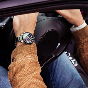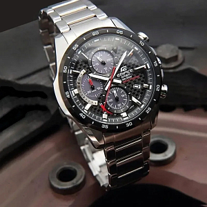Перед вами харизматичный хронограф Edifice со спортивным характером из серии EQS-900 в стальном корпусе с текстурированным карбоновым циферблатом, черным безелем на стальном браслете.